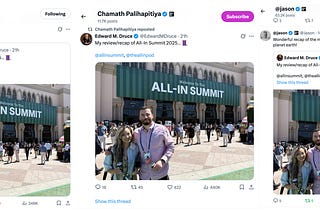 Sunday to Tuesday I attended the All-In Summit – the annual event of the All-In Podcast (#1 podcast in technology) – in Los Angeles.