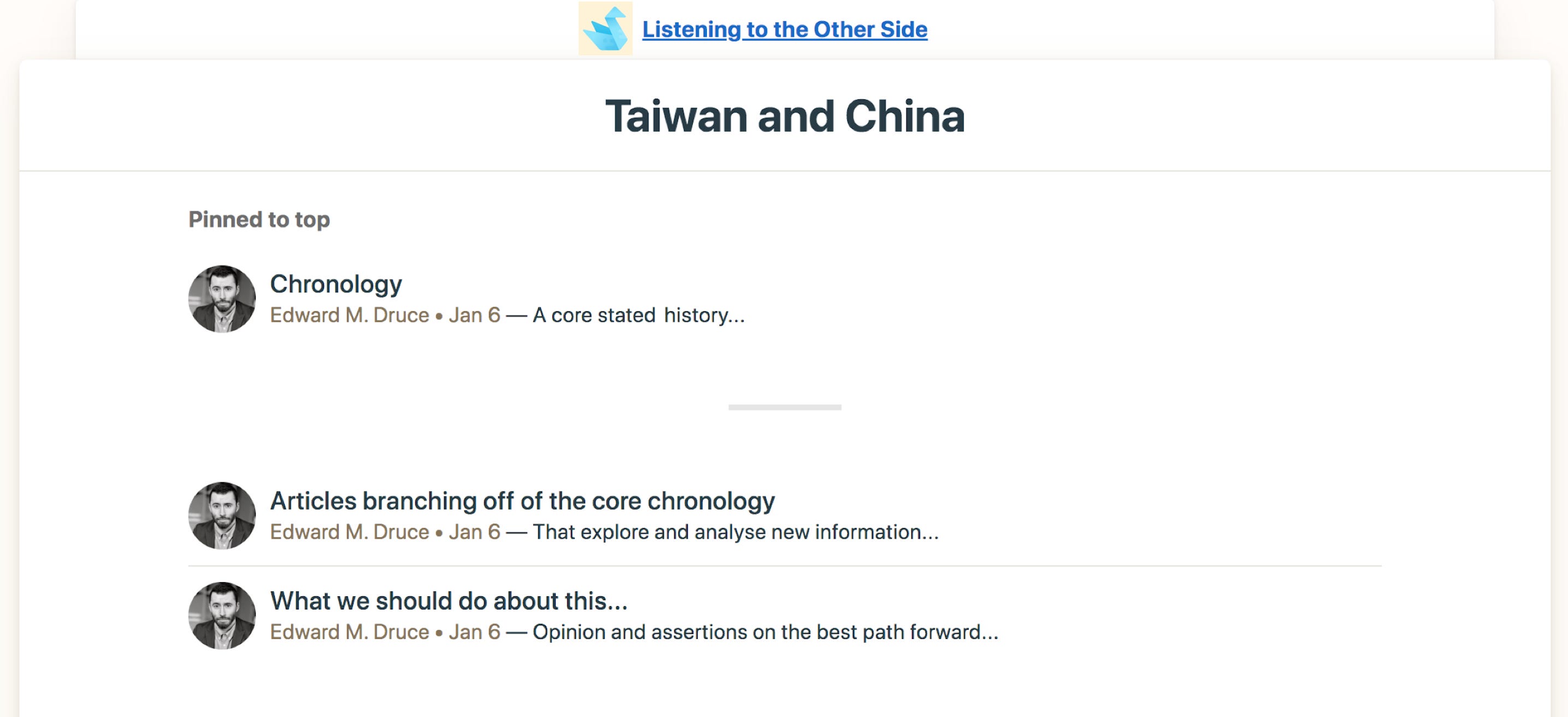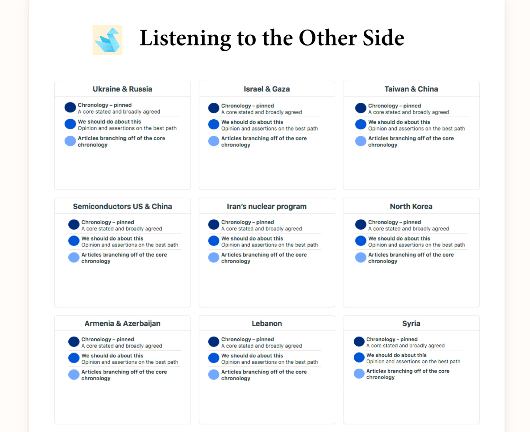 [*] Below this pinned history, have articles branching off of the core chronology, that explore and analyse new information – and opinion-based assertions as to what to do.